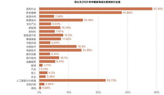 医药行业、养老健康和人工智能被认为是中国最具成长前景的行业。在医药、养老健康、旅游休闲、教育培训、文化产业等共22个行业中,受访者认为最有成长前景的前3项分别是医药、养老健康和人工智能(选择比例分别是57.4%、41.9%和33.7%),第二梯队的是教育培训(22.2%)、信息技术(21.4%)和生物技术(18.9%)。对其他行业的看法,受访者间的分歧较大。在这当中,排名第一和第二的都是与疫情相关的产业,显示了疫情等突发公共卫生事件对产业发展有重大影响。