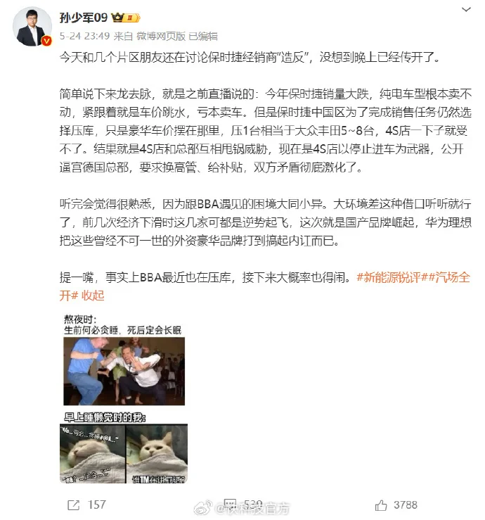 车评人孙少军在微博上表达了隐忧:“因为跟BBA遇见的困场大同小异……事实上BBA最近也在压库,接下来大概率也得闹。”