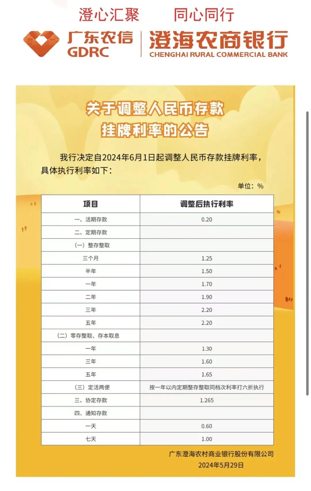 在5月底,广东澄海农商银行也发布公告表示,该行将于6月1日起调整人民币存款挂牌利率。其中,该行1年期、2年期、3年期、5年期整存整取存款具体执行利率分别为1.7%、1.9%、2.2%和2.2%,分别较之前对应期限的存款利率下调了8bp、10bp、20bp、以及25bp。