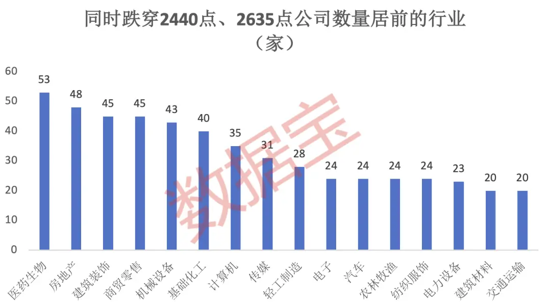 其中,同时跌穿2440点、2635点时价的公司有690家,这些公司最新市值平均不足50亿元,其余公司平均市值超过200亿元。从行业分布来看,属于医药生物、房地产、建筑装饰、商贸零售的公司数量居前,均为45家及以上;如银行、国防军工、石油石化、煤炭等高股息、抗跌板块的公司数量较少。