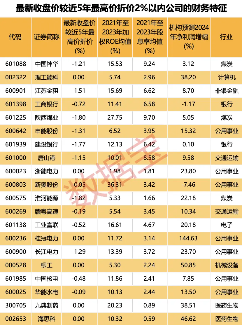 据数据宝统计,上述161家公司中,2023年加权ROE、股息率均超过1.5%,且机构预测2024年净利润增幅超过15%的公司(且2023年为盈利)仅有6家。