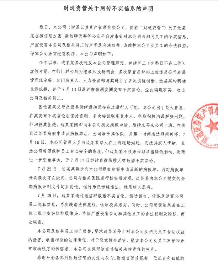 财通资管提到,今年以来,边某某多次违反本公司管理规定,包括旷工(含整日不在工位)、虚假考勤、在部门群公然拒绝参加投研例会、多次穿着吊带衫上班违反公司着装管理规定等。部门负责人、人力资源部与其进行了多次提醒谈话,边某某均明确表示抗拒,并于7月13日通过微信朋友圈发布不实言论,歪曲编造事实,攻击公司及相关员工。