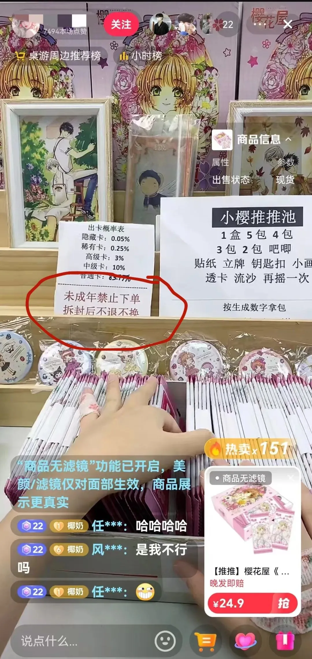 ▲ 某拆卡直播间放置 “ 未成年人禁止购买,拆 封 不退不换 ” 提示牌