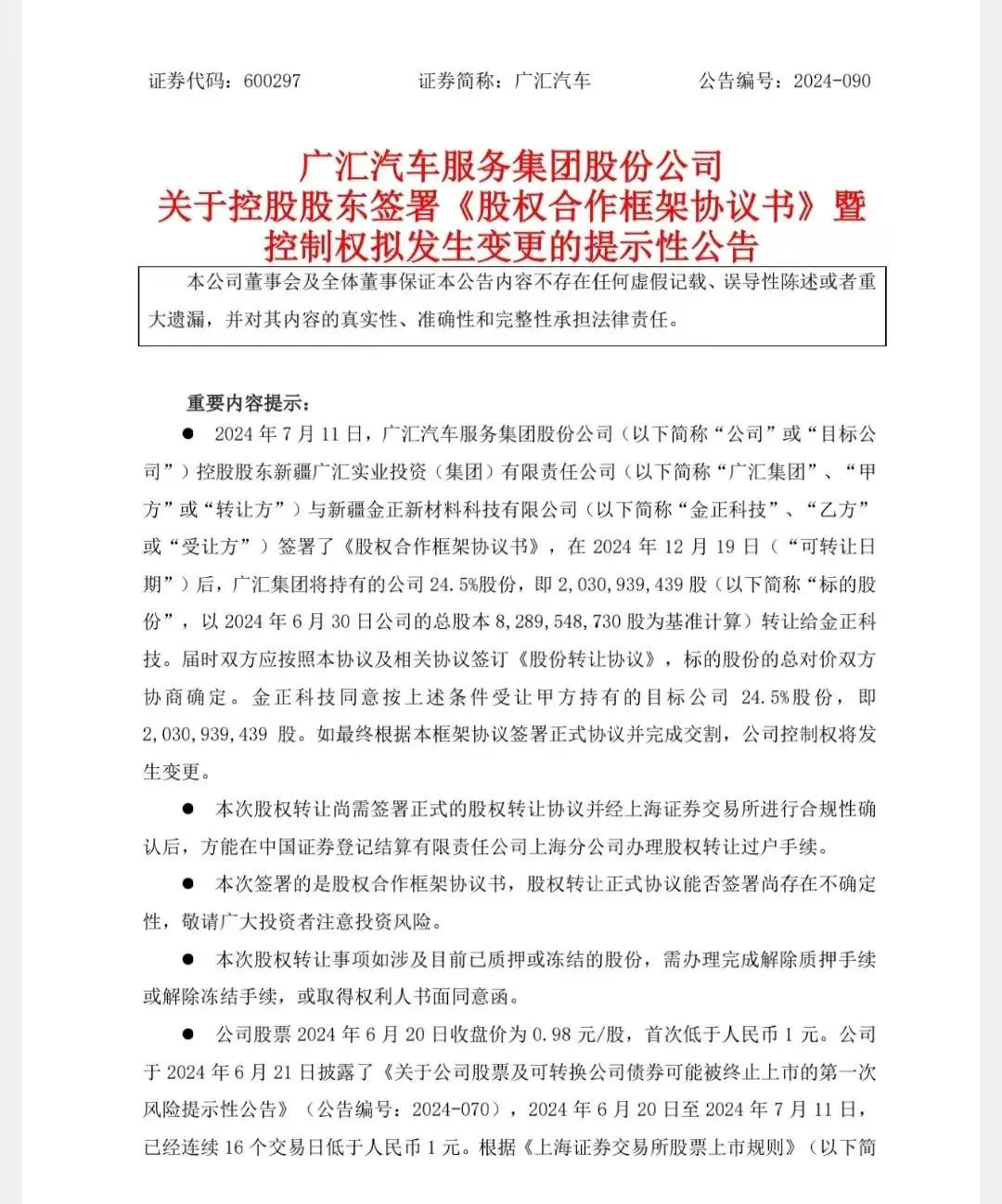 7月10日,广汇汽车公告称,收到广汇集团发来的《关于正在筹划广汇汽车控制权变更有关事项的通知》,目前广汇集团正在与新疆金 正新材料科技有限公司(以下简称:金 正科技)筹划公司股权转让事宜,此次交易可能触发公司控制权的变更。7月11日晚,广汇汽车发布公告称,控股股东拟将24.5%股份转让给金 正科技,控制权拟发生变更。7月12日晚间,广汇汽车又发布公告,与中钧科技签订战略合作协议,加速科技转型。受此消息影响,广汇汽车股价在7月11日和12日连续涨停,12日收盘价0.96元,离站上1元近在咫尺。