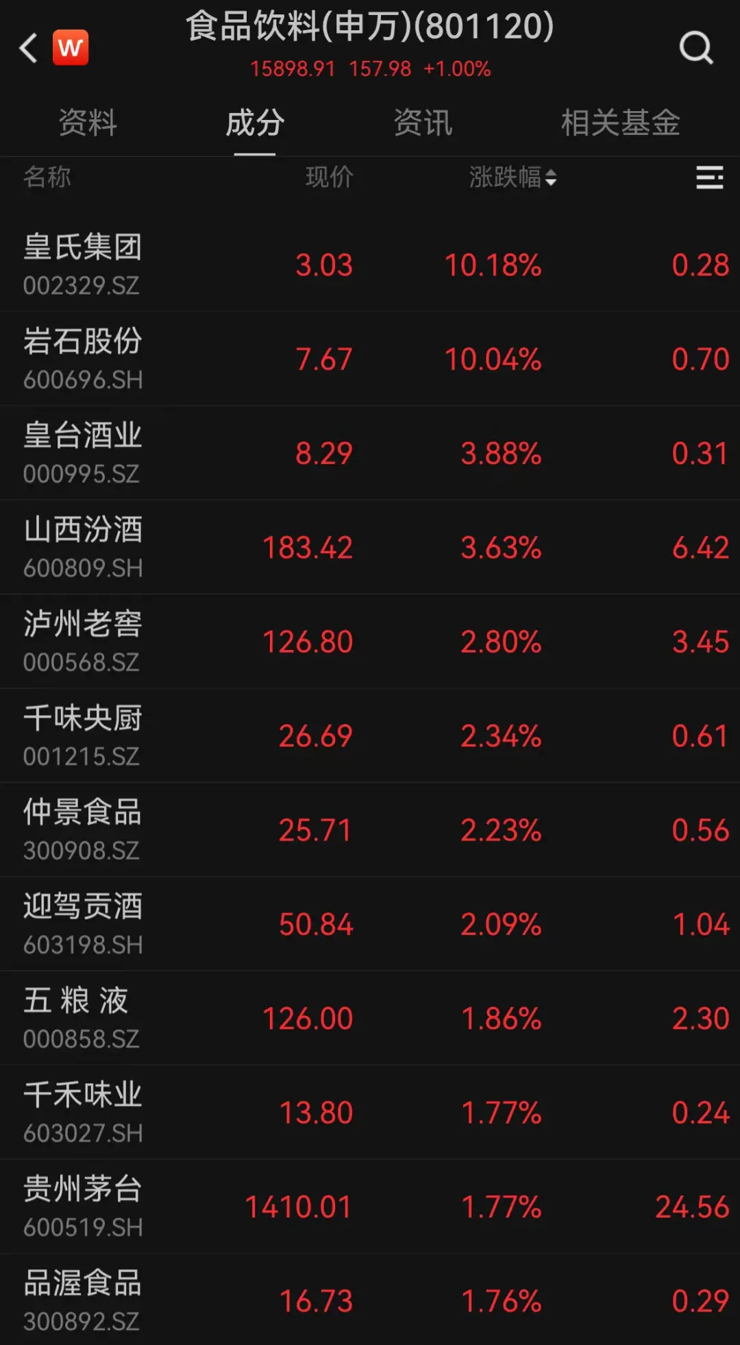 食品饮料板块方面,皇氏集团、岩石股份涨停,皇台酒业、山西汾酒、泸州老窖、千味央厨、仲景食品、迎驾贡酒均涨超2%。
