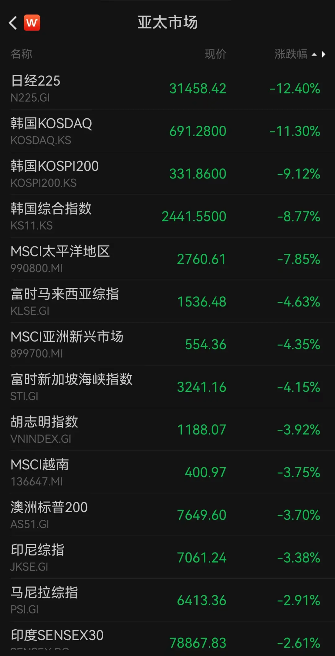 富时新加坡海峡指数盘中跌超5%,越南VN指数、富时马来西亚综指、印尼综指盘中跌超4%,印度SENSEX30指数盘中跌超3%,澳洲标普200指数盘中跌超3.8%。