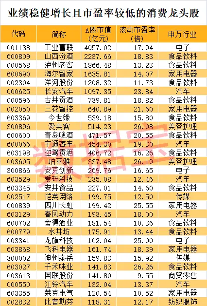 大消费领域涉及行业广泛,数据宝以食品饮料、家用电器、商贸零售、纺织服饰、消费电子、游戏、社会服务、美容护理、汽车等与日常消费、可选消费关系密切的行业为基础,从中筛选出业绩稳健增长,且市盈率较低的超跌龙头股,具体条件如下: