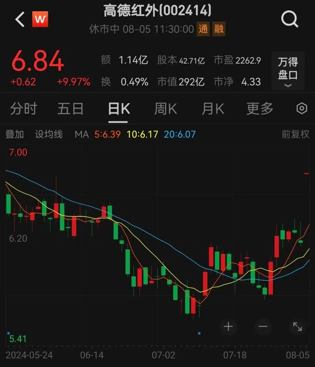 高德红外一字涨停。最新股价6.84元/股,总市值292亿元。上周五收盘后,高德红外发布了收到中标通知书的公告。