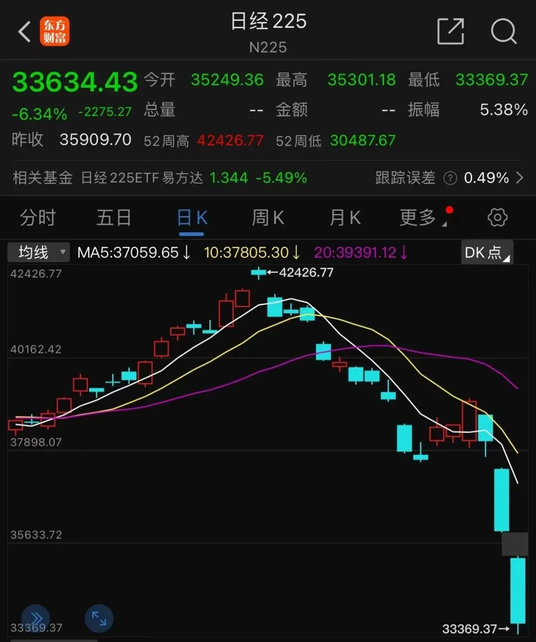 日经225指数盘初跌幅迅速扩大,失守34000点,盘中一度跌超7%。日本东证指数暴跌,熔断机制被触发。