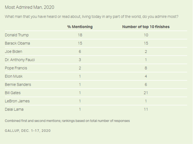 据该公司报道,调查中有48%的共和党人认为特朗普是最受尊敬的人,其他公众人物没有一个获得超过2%的共和党人投票。而民主党人中,去年投给奥巴马的民主党人有41%,今年却下降至32%。对于在疫情中表现突出的福奇,有5%的民主党人认为他值得被人们尊敬,而共和党只有1%的人这样认为。