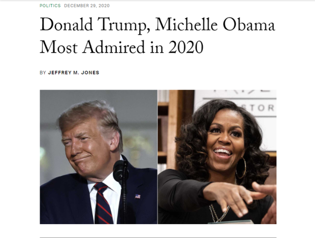 据报道,民意调查公司盖洛普(Gallup)在美国当地时间12月29日发布的民意调查显示,美国即将卸任总统唐纳德·特朗普位居2020年最受尊敬的人男性榜单之首。该年度调查询问了受访者,今年他们最崇拜的世界各地的男性和女性人物。有18%的人认为特朗普最受尊敬,这让特朗普取代了美国第44任总统巴拉克·奥巴马蝉联12年的榜首位置。