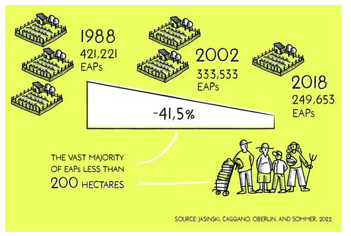 据阿根廷农业普查数据,由于土地日益集中在少数精英手中,全国农业用地持有数量在1988年至2018年间约下降了41.5%