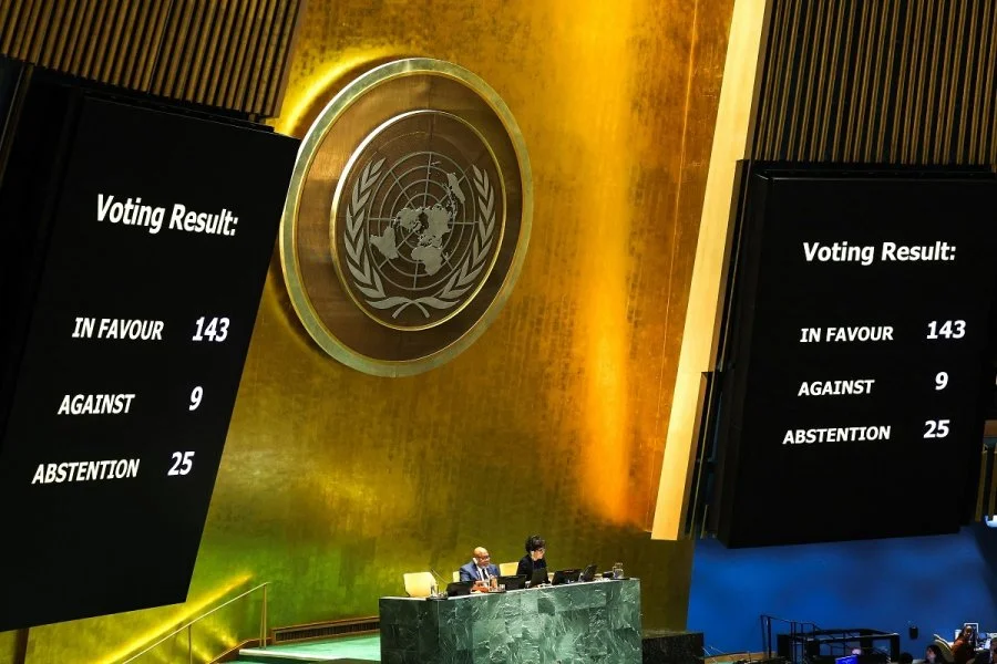 5月10日,联合国召开紧急会议,认定巴勒斯坦符合《联合国宪章》规定的成员国资格,应被接纳为联合国正式成员,大会具体投票结果为143票赞同,9票反对,25票弃权。