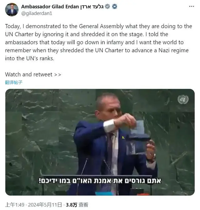 在这种矛盾下,在日前美国否决了巴勒斯坦加入联合国的议案的背景下,最终在联合国又爆发了一场火星撞地球的大事件!