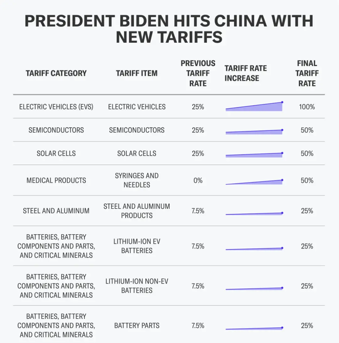 电动汽车,关税从25%升至100%,是征税最高的领域。