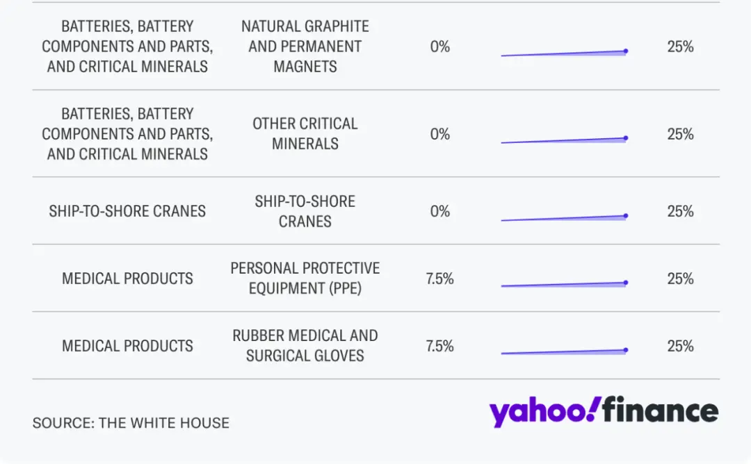 部分钢铁和铝制品,关税从0-7.5%,增至25%。