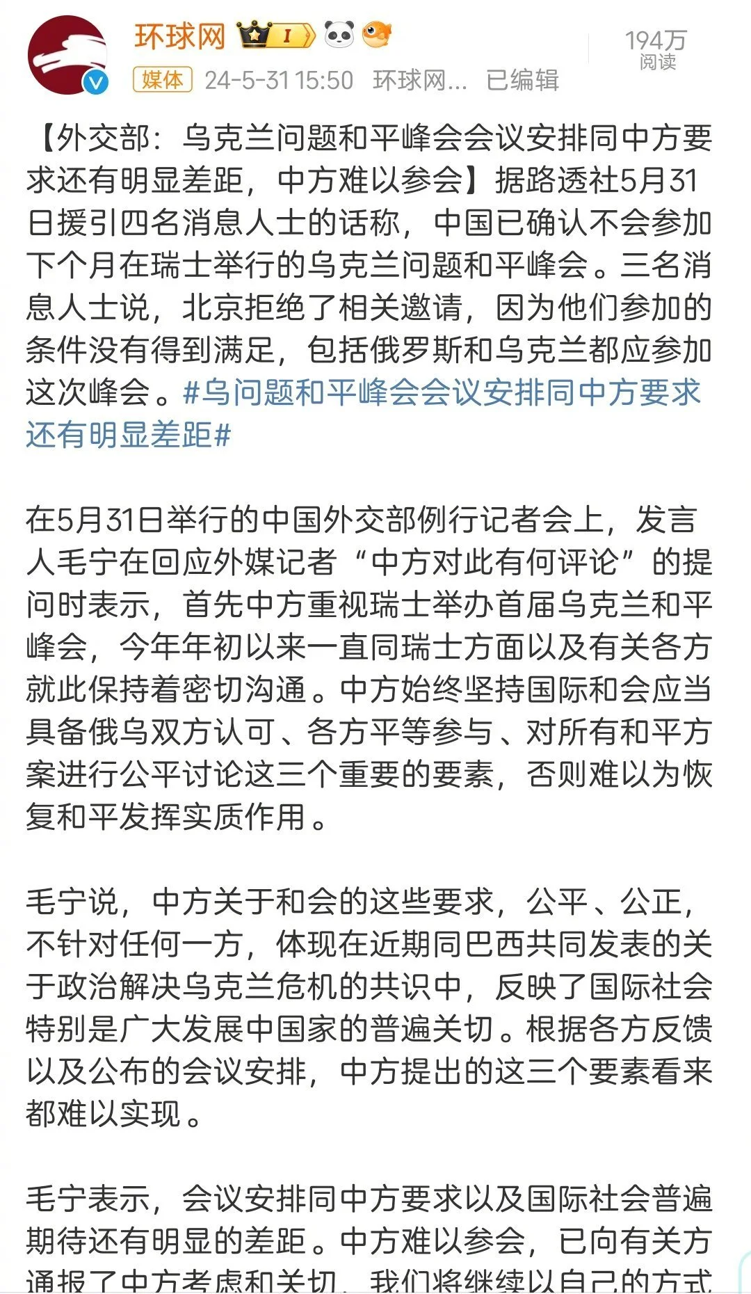 既然是“乌克兰问题和平峰会”,就应该有乌克兰和俄罗斯双方参加。只有乌克兰一方唱戏,另一方俄罗斯被排斥参加,这算什么“和平峰会”?可以叫“援助乌克兰峰会”或者别的什么,这是常理吧。中国不参加是对的,坚守我们的战略自主,不跟着美西方跑,同时也不与他们对抗,就这样。