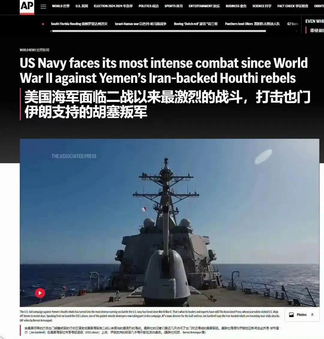胡塞武装明显让美国头大了,美国无奈地承认,“打击胡塞武装是二战以后最激烈的海战”。