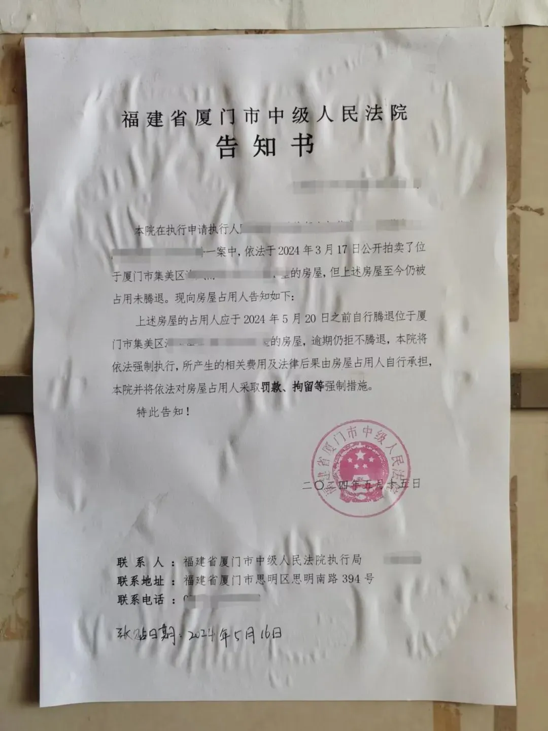厦门中院于2024年3月17日公开拍卖了上述房屋并成交后,上述人员不仅未按期腾退,加藤某子更扬言如法院强制腾退,其要跳楼。厦门中院多次口头和书面告知、劝说,上述三人仍拒不腾退,导致买受人接收房屋受阻。