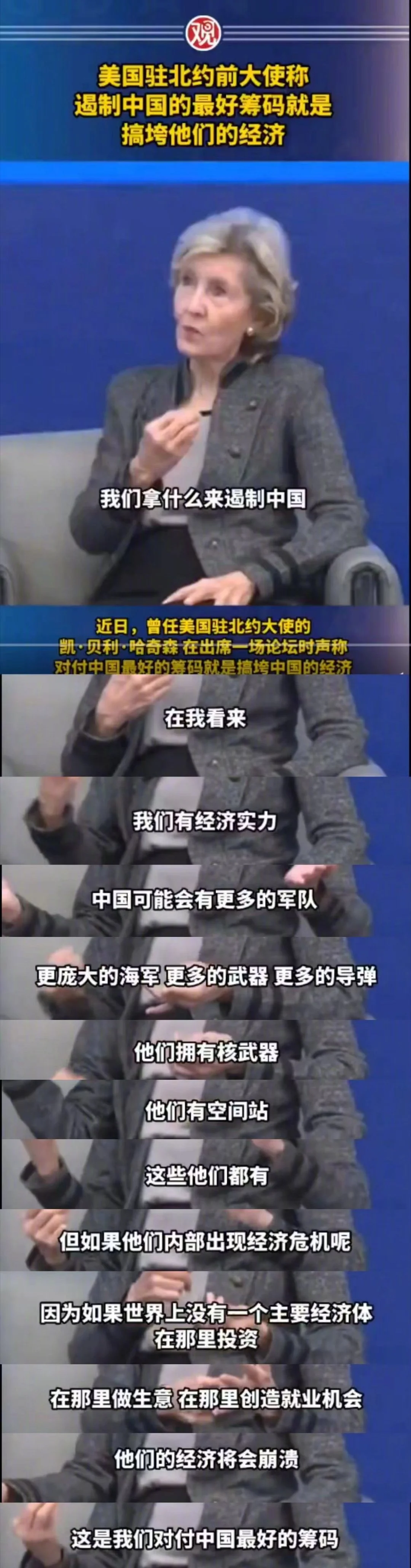 经济对中国来说有多重要,这位严重敌视我们的美国前大使做的上述坦露,给了我们理解这个问题的一个新角度,它清晰得像一面镜子。她可是驻北约前大使,应该最擅长从军事角度思考对中国的遏制,但是这位前大使缺少那样的信心,她认为中国会有“更多的军队,更庞大的海军,更多的武器,更多的导弹”,以及“核武器、空间站”,是美国挡不住的。另外她大概认为,毕竟美国的航母更多,核导弹更多,加上盟友的支持,有能力在终极军事力量比拼中压倒中国。