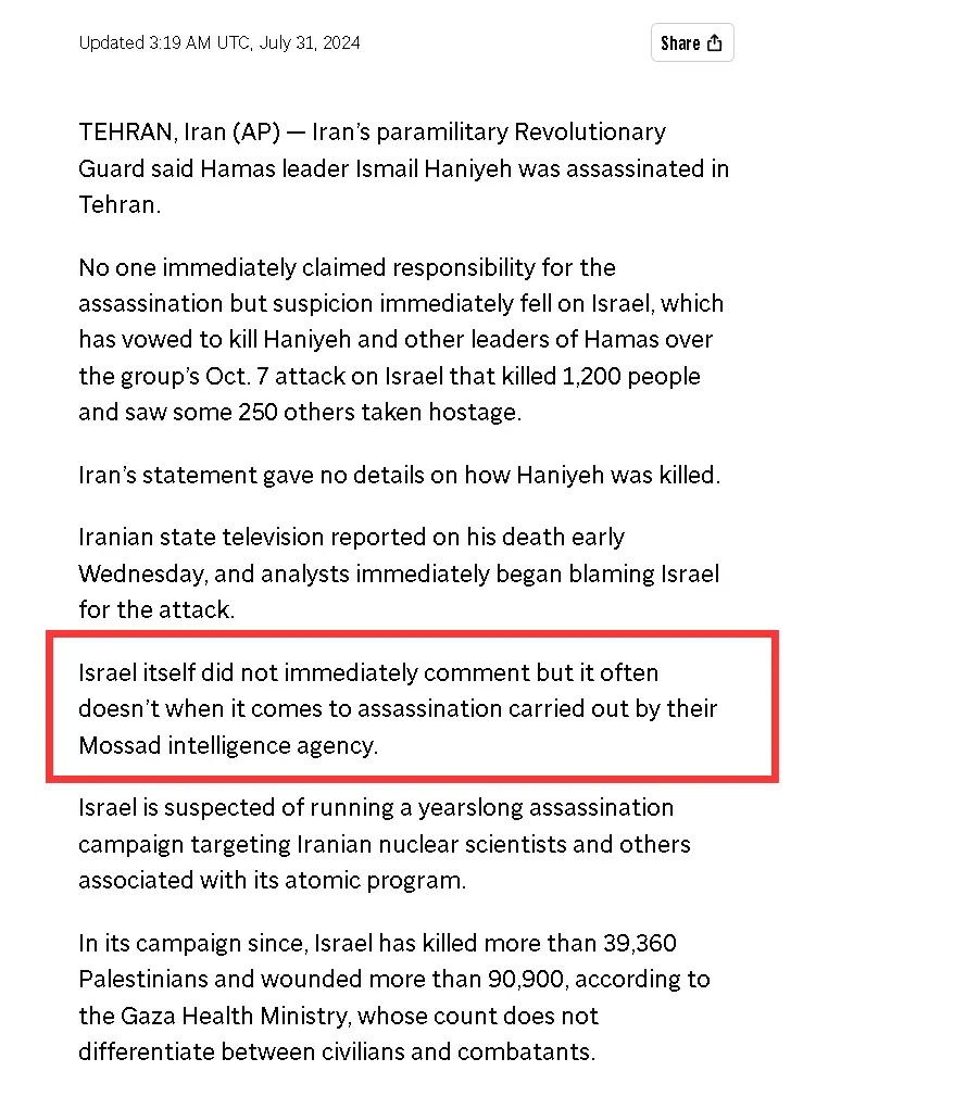 原来,在哈尼亚遇刺后,美联社很快就出了报道,并被包括《以色列时报》在内的多家媒体引用。其中,美联社在报道中特别提了这么一句话:以色列方面目前并没有立刻做出回应,但以色列方面通常也不会对他们的情报机构摩萨德开展的刺杀行动进行回应。