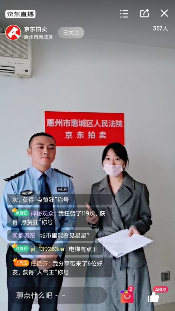 我院分管执行工作的审判委员会专职委员苏程玲介绍:今天,我院执行法官和执行员通过京东司法拍卖网络平台进行直播“带货”,是我院司法拍卖的新尝试,从今天网友围观和点赞的情况看,达到预期效果。